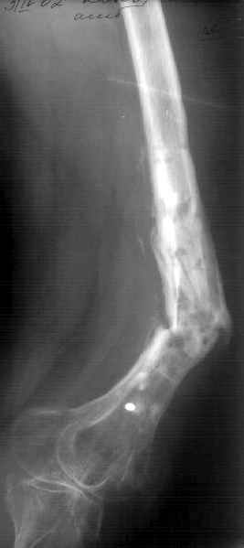 Если инфекция присутствует (вполне возможно, судя по рентгенограмме), резекция инфицированной, некротизированной кости, замещение образовавшегося дефекта с помощью транспорта костного блока в аппарате.