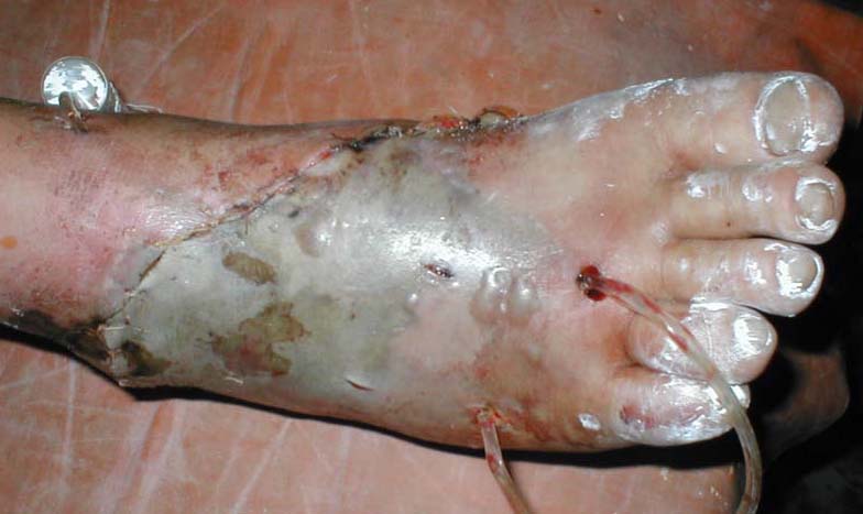 Мужчина, 48лет. Производственная травма (на стопу упал груз весом 2 тонны+химический ожог щелочью). Диагноз: комбинированная травма правой стопы, обширная рвано-скальпированная рана, химический ожог II ст. до 1% поверхности тела, закрытый перелом ладьевидной и I клиновидной костей. Ургентно произведено: ПХО, дренирование, иммобилизация задней гипсовой лонгетой; назначено: обезболивание, реополиглюкин, цефазолин, метрогил, курс ГБО. Вопрос: тактика лечения (дополнения и проч.)?Заранее благодарен! Фото 1 Фото 2 Фото 3 Фото 4 С уважением,А.В.ВладзимирскийДонецкий НИИ травматологии и ортопедииДонецк, Украина