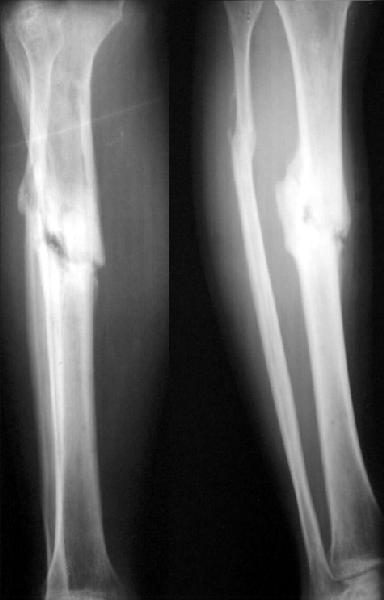 Пациент 26 лет 7.02.2002 был сбит легковой машиной в небольшом городке. По поводу перелома костей голени 15.02.02 в местной больнице был наложен аппарат, который был снят 25.05.02. Перелом закрытый, воспаления таней у спиц, со слов больного, не было. После снятия была патологическая полдвижность, наложена гипсовая шина, которую пациент через месяц снял сам. Ходил с частичной нагрузкой. Сейчас ходит с тростью, отмечает болезненность в проекции перелома. Явной патологической подвижности при осмотре не выявили, хотя, конечно, нагрузки прикладывали не самые максимальные. Снимки свежие (фас+профиль и косые).Какой здесь на сегодня уместен диагноз? Псевдартроз? Несросшийся перелом? Замедленная консолидация? Сросшийся на органиченном участке?Как-то иначе? В плане у нас - закрыто заштифтовать большеберцовую кость "как есть" с динамическим блокированием. Или потребуется закрытая остеоклазия? Надо ли делать остеотомию малоберцовой? Нужны ли, на Ваш взгляд, еще какие-то дополнительные меры, костная пластика, например?Заранее спасибо.