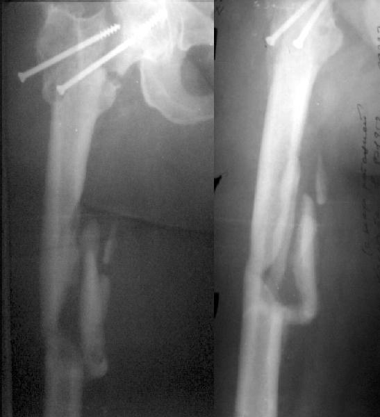 Р-граммы б-го через 5 лет после лечения). Целесообразно планировать МВО в комбинации с костной пластикой. Я предпочитаю несвободную к.пластику на питающей ножке (гребень подвздошной кости на m.tensor f.lata), в этом случае трансплантат помещается по передней поверхности линии ложного сустава.