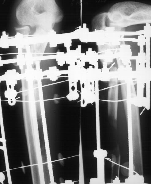 Мужчина 34 лет получил открытый перелом локтевой кости в апреле 1997 г. Через 2 недели - остеосинтез пластиной в местной больнице. Через 8 мес. пластика по Хахутову. В январе 2000 г. - аутопластика из крыла подвздошной кости. Трансплантат рассосался. С декабря 2001 г. наблюдается в институте. В январе 2002 г. - удаление пластинки, резекция концов отломков, остеотомия дистального отломка, дистракционный остеосинтез по Илизарову. Проводилась дистракция по 0,5 мм/сут., с перерывами на 10-14 дней. Ввиду слабой регенерации темп уменьшен до 0,25 мм/сут. Дистракция закончена в июле 2002 г (см. приложение 1). Декабрьский снимок (приложение 2) показывает лизис концов отломков, замедленную перестройку регенерата. Признаков воспаления нет и не было. Анализы спокойные. Как расценивать ситуацию? Какой выход из нее имеет наибольшие шансы на успех? Заранее спасибо, и еще раз с наступающим Новым Годом!!