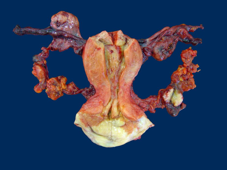 Samp(02) - макропрепарат удаленной матки с придатками и клетчаткой (операция Вертгейма). В клетчатке слева - рассеченный метастатический узел белого цвета