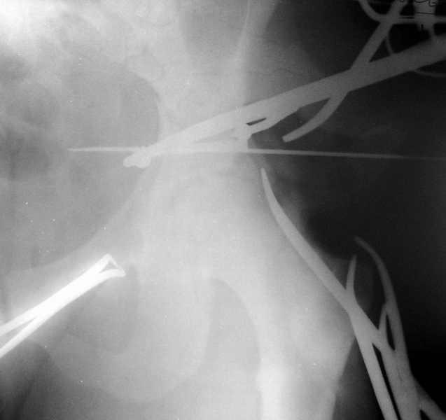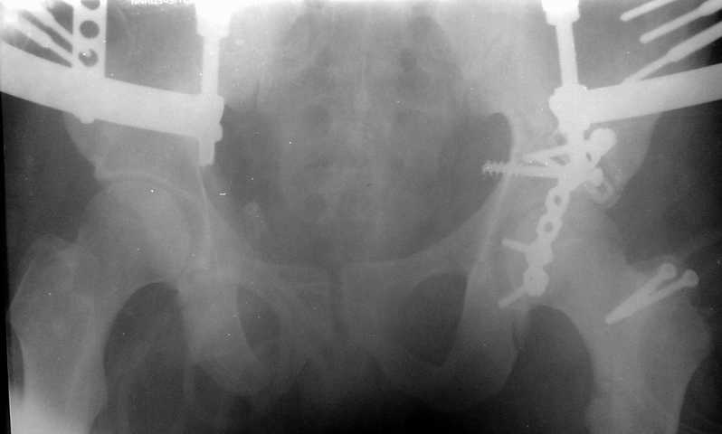 Травма 17 ноября 2002 г., поступил к нам 1 декабря, оперирован 8-го - открытая репозиция, остеосинтез пластинками и винтами. Учитывая повреждение переднего полукольца справа, и крестца и крестцово-подвздошного сочленения слева, наложили аппарат на 2 месяца.