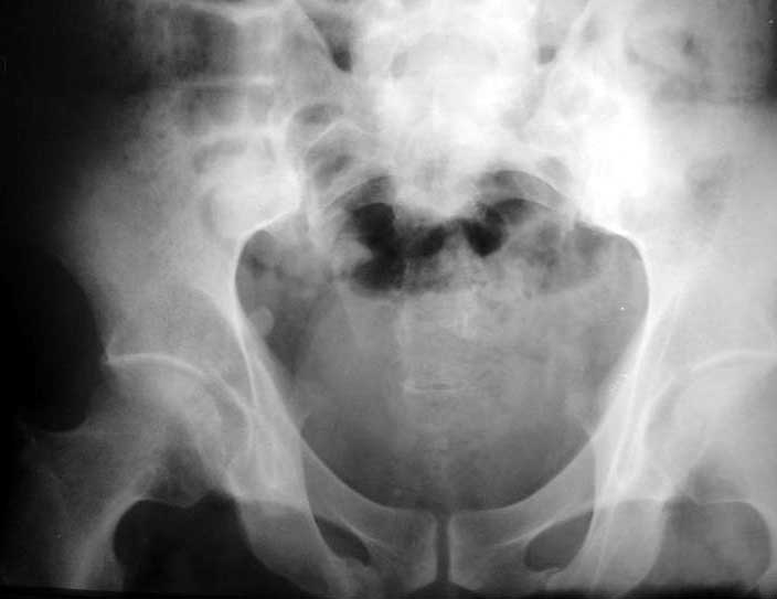 I think this is just a pelvic ring disruption that has gone on to a non-union. The arrow is pointing to the inferior ramus non-union, and