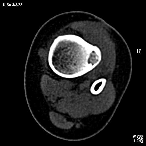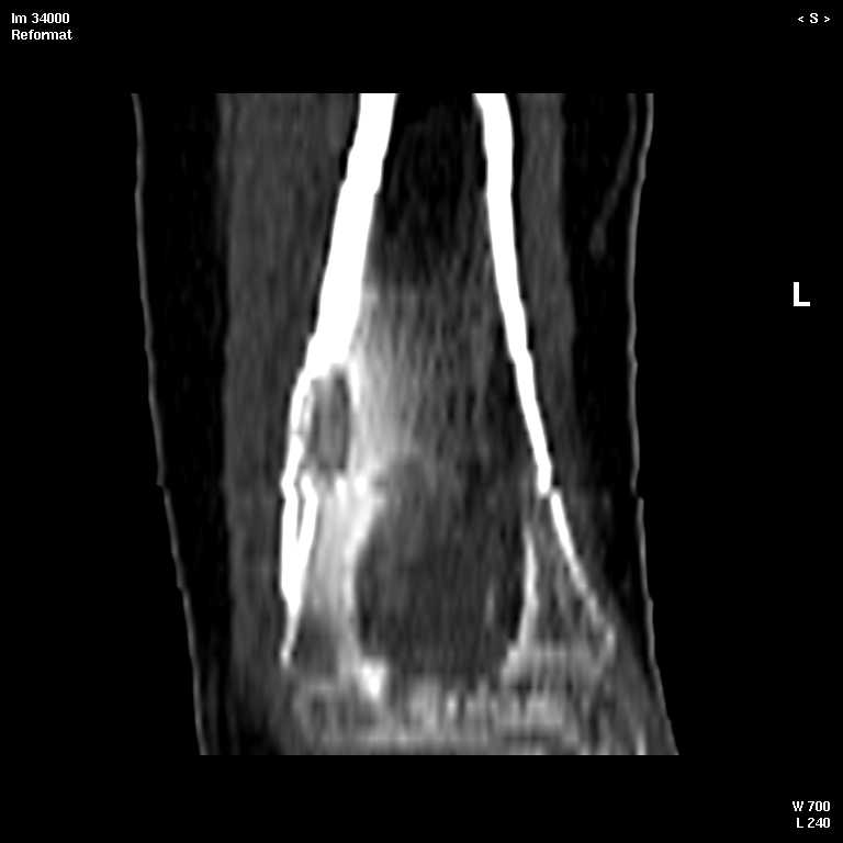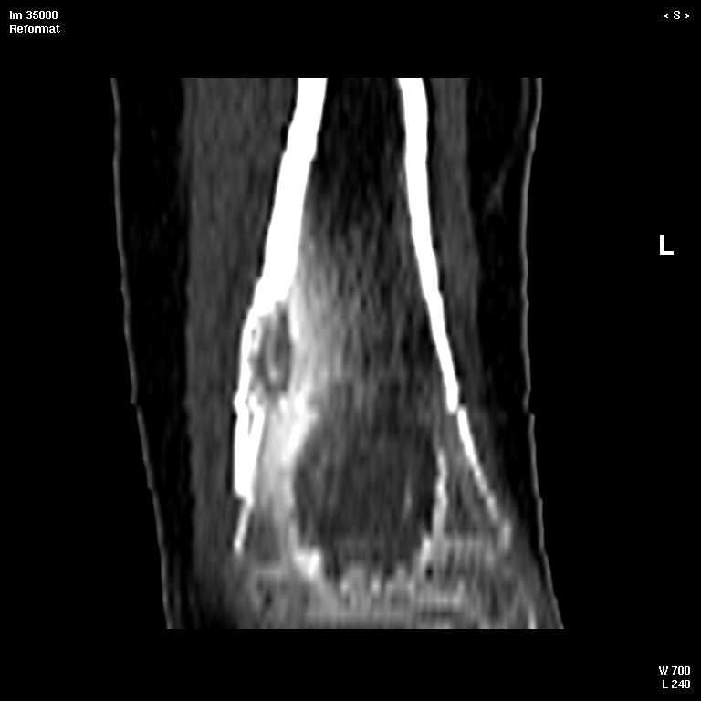 С подозрением на хондрому большеберцовой кости левой голени выполнена компьютерная томография. На серии томограмм получены изображения дистальных отделов левой голени. В дистальном метафизе на уровне нижней трети по латеральному краю определяется кортикальный очаг деструкции размерами 1,3x0,5x0,8 см. На уровне очага деструкции отмечается истончение кортикального слоя, без признаков его разрушения. Кость на уровне очага вздута. Структура окружающих мягких тканей не нарушена, объемных образований не определяется. Крупные нервные стволы и просветы крупных сосудов хорошо дифференцируются. Кожа и подкожно-жировая клетчатка не изменены.Заключение: КТ - признаки кортикального остеолитического очага деструкции в дистальном отделе метафиза левой большеберцовой кости без признаков разрушения кортикального слоя (остеогенная саркома?).19.11.2002 г. осмотрена онкологом, выставлен диагноз: саркома левой большеберцовой кости?Лабораторные исследования: - ОAK от 06.11.2002 г. - L - 11,3х109; эр. - 4,47хЮ12; НЬ - 117 гр./л; Ht - 33,6%; тр. -208x109; СОЭ - 38 мм./час, э-1; п-7; с-55; м-4; л-33.В отделении детской онкологии 11.12.02 выполнена операция: секвестр-некрэктомия н/3 левой большеберцовой кости.Послеоперационный период без осложнений.Проведено лечение. Линкомицин 150 мгхЗ р./д., обезболивание (анальгин, димедрол). Швы сняты 23.12.02, заживление первичным натяжением.Получен результат гистологического исследования: хронический остеомиелит. Данных за онкопроцесс нет.На приеме врача ортопеда поликлиники с жалобами на усиление болевого синдрома 03.01.03. Наложена задняя гипсовая лангета. Назначен противовоспалительная терапия, препараты Са и кальцийтониновые препараты. На фоне проводимого лечения болевой синдром купировался. На серии рентгенограмм (январь-февраль-март) На нижней трети левой большеберцовой кости наличие дополнительного кортикального очага диструкции с размерами 1.5x0,5 см., в динамике отмечается увеличение в размерах.С подозрением на рецидив хронического остеомиелита большеберцовой кости левой голени выполнена компьютерная томография.19/03/2003 На серии томограмм получены изображения дистальных отделов нижней трети левой голени и мягких тканей.В метафизе определяется очаг деструкции с четкими, неровными контурами, неоднородной структуры, за счет костных балок, размерами 1.8x1.8x2,4 см, плотностью 29 ед Н.В дистальном методиафизе. по латеральному краю, определяется кортикальный очаг деструкции, размерами 0,6x0,5x2,0 см, неоднородной структуры, за счет наличия фиброзных и костных балок, кортикальный слой истончен, без признаков разрушения.Структура окружающих мягких тканей не нарушена, объемных образований не определяется. Крупные нервные стволы и просветы крупных сосудов хорошо дифференцируются.Кожа и подкожно-жировая клетчатка не изменены.ЗАКЛЮЧЕНИЕ:КТ-картина состояния после операции. Формирование постоперационной, внутрикостной кисты. КТ-признаки объемного образования нижней трети левой большеберцовой кости, вероятнее всего фиброзная дисплазияРЕКОМЕНДАЦИИ: МРТ левого голеностопного сустава с захватом нижней трети голени.Лабораторные исследования: OAK от 05.03.2003 г. - L v 7.0х109; эр. - 4,74хЮ12; НЬ - 130 гр./л; Ht - 37%; тр. -274x109; СОЭ - 4 мм./час, э-1; п-1; с-53; м-3; л-42.Вопросы: уточнение диагноза? (хр.остеомиелит, обострение? Или все таки онкопроцесс) какие исследования провести? тактика лечения? КТ-