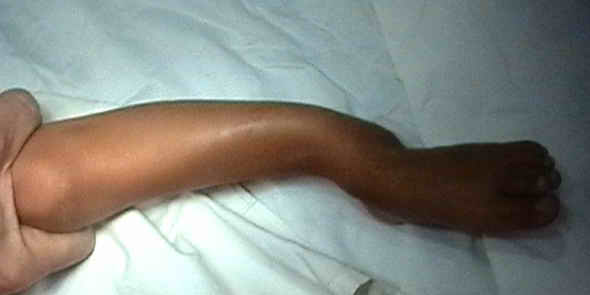 На консультативный прием родители привели ребенка 3 лет с деформацией левой голени. Деформация была выявлена сразу после рождения ребенка и с его развитием усиливается хромота. При ходьбе ребенок полностью наступает на ногу, распределяя нагрузку на внешний край стопы.Нагрузка на ногу безболезненна, данных за травму или инфекцию нет. При осмотре кожных покровов отмечаются характерные пигментные пятна cafeau lait. Совокупность данных анамнеза и осмотра наводит на мысль о нейрофиброматозе с врожденным псевдоартрозом б\б кости. Рентгенограммы прилагаю. Заранее признателен за высказанные мнения по тактике лечения ребенка.С наилучшими пожеланиями,Евгений Чекашкин