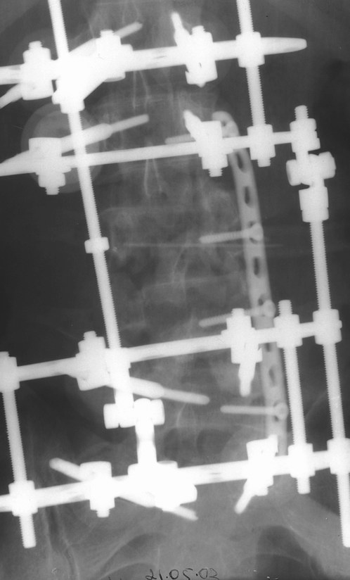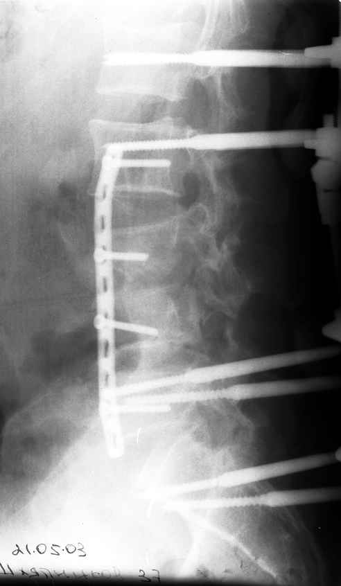 Первым этапом наложен наружный транспедикулярный аппарат, грубая деформация позвоночника устранена. Затем пациент перевёрнут на бок и выполнен забрюшинный доступ по Чаклину. При ревизии обнаружены дислоцированные позвонки "внедрившиеся" в m. psoas. Что интересно, передняя продольная связка хотя и была натянута как струна и отслоена от тел смежных позвонков, но не разорвалась. Ревизия позвоночного канала обнаружила достаточное жизненное пространство для дурального мешка вследствии произошедшей травматической ламинэктомии. Задние отделы повреждённых сегментов переломаны в "крошку". Диск L2-l3 был повреждён поэтому выполнен спондилодез L2-L5. При этом тела 4-го и остатки тела 3-го позвонков использованы в качестве костнопластического метерьяла. Тело 4-го позвонка вертикально и использовано для замещения дефектов на уровне сегментов L3,L4. Для фиксации отломков использована пластина. Стабилность позвоночника обеспечивается АВФ. Неврологическая симптоматика в послеоперационном периоде практически не изменилась. Получает комплексное лечение, планируется в скором времени его вертикализация.