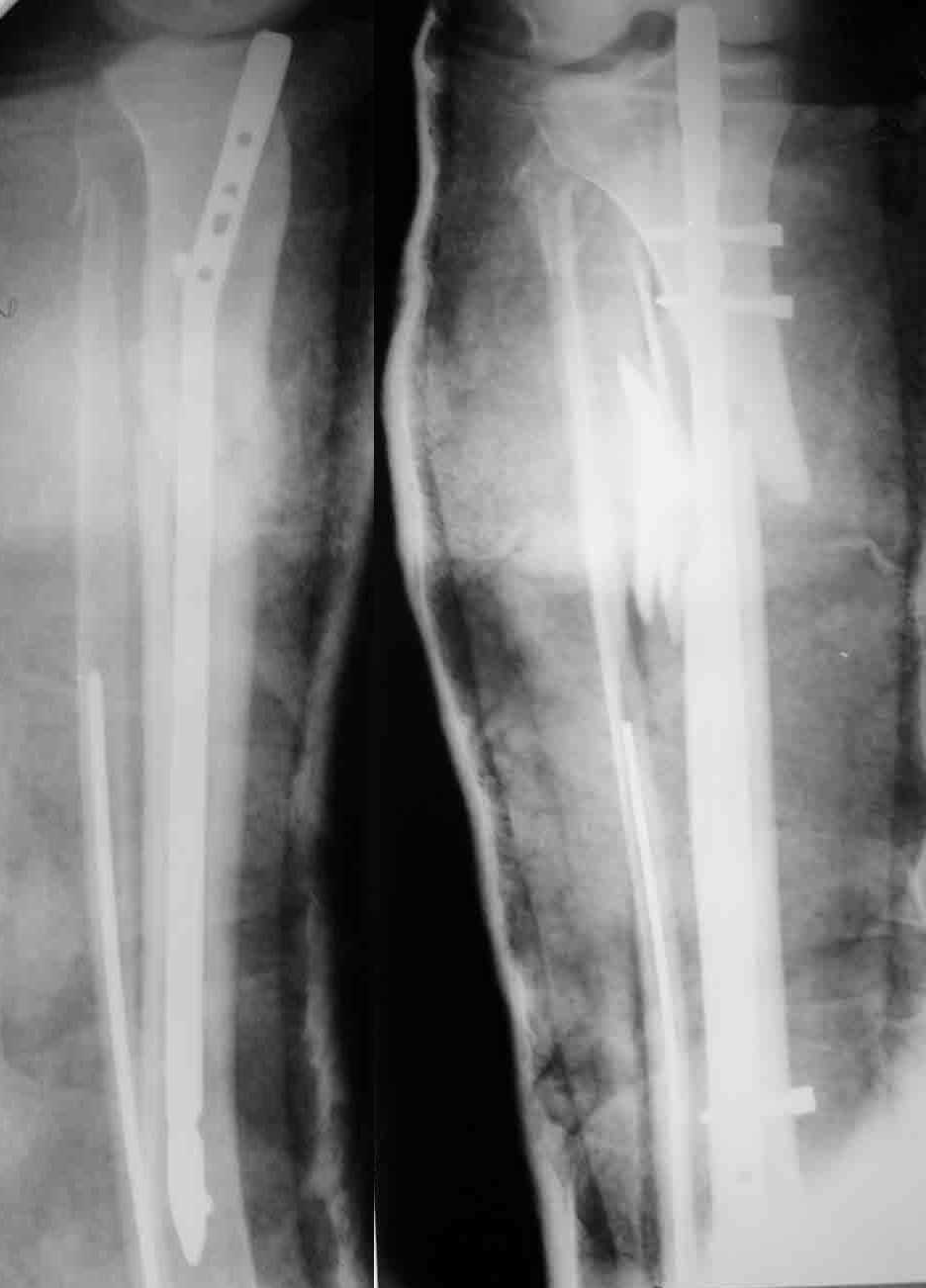 A female 24 years old, a sister of a friend of mine (not physician) living in Moscow, 3 weeks ago admitted to the hospital in Moscow after a car accident (was a pedestrian) with a tibial shaft fracture. 3 days ago closed locked nailing was performed, see attached films. Now he is in panic because they are going to remove the nail and perform plating. It seems to me the situation can be solved on the current nail with a minimal procedure - insertion of wires into distal and proximal tibia, acute distraction and proximal static locking. Maybe dynamic locking screw should also be removed before. As a maximum i would assume to pull the nail to the central fragment, insert poller wire or screw, then insert of the nail back and lock it.