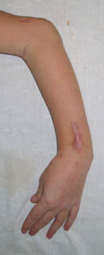 Мое упущение - не указал, что одним из "поводов" к открытому вмешательству была необходимость тенолиза разгибателей. На исходной фотографии виден втянутый (спаянный с костью) рубец, вынужденное положение пальцев кисти.