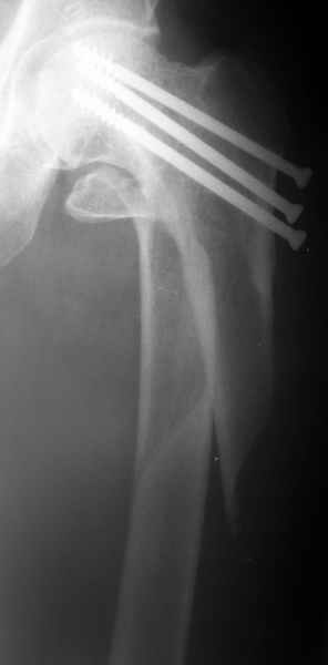 another caseof a subtrochanteric fracture through screw holes for femoral neck fracture fixation.