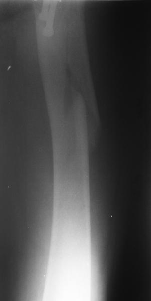 The screws were removed through a stab wound. Then a closed insertion of an unreamed solid nail 13 mm was performed and the nail statically locked - 3 screws 6 mm in the proximal fragment and 1 in the distal.