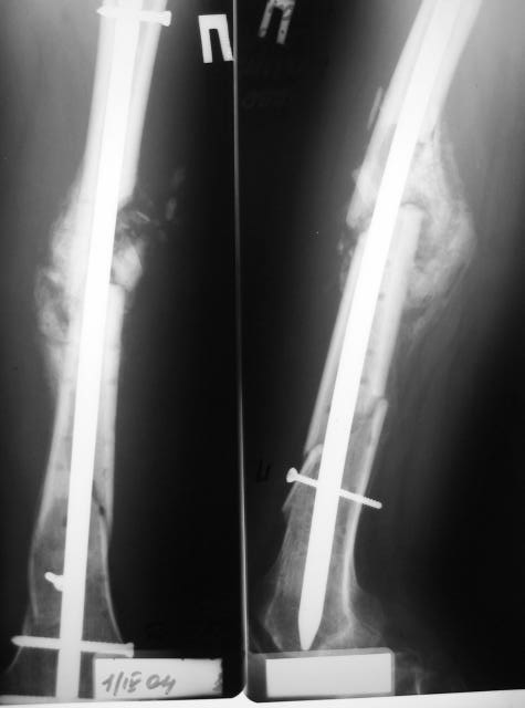 Раны зажили хорошо, швы снял. Сделали контрольный рентгеновский снимок бедра. Движения в коленном суставе востанавливаются, угол 94 гр.