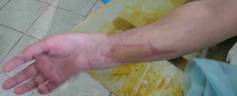 Судя по фотографии, у пациента были повреждены не только срединный нерв и лучевая артерия, но и сгибатели -- на уровне перехода мышц в сухожилия.
