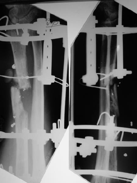 В приложении - снимок по окончании дистракции, и после смены аппарата на стержень (довольно толстый, 5 мм). С входом в канал на центральном отломке пришлось малость попотеть, промежуточный отломок его прикрывал. Но все-таки удалось закрыто проколупать. Надеюсь, дня через 3-4 после операции можно будет передать пациента нейрохирургам. Буду признателен за критику и комментарии.