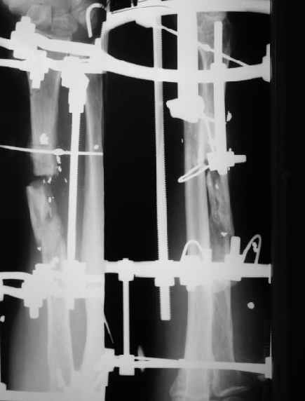 Вариант 2: Резекция склерозированной части дистального отломка, остеотомия в метадиафизарной зоне и билокальный остеосинтез по Илизарову.