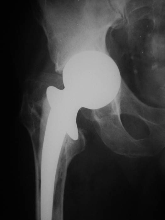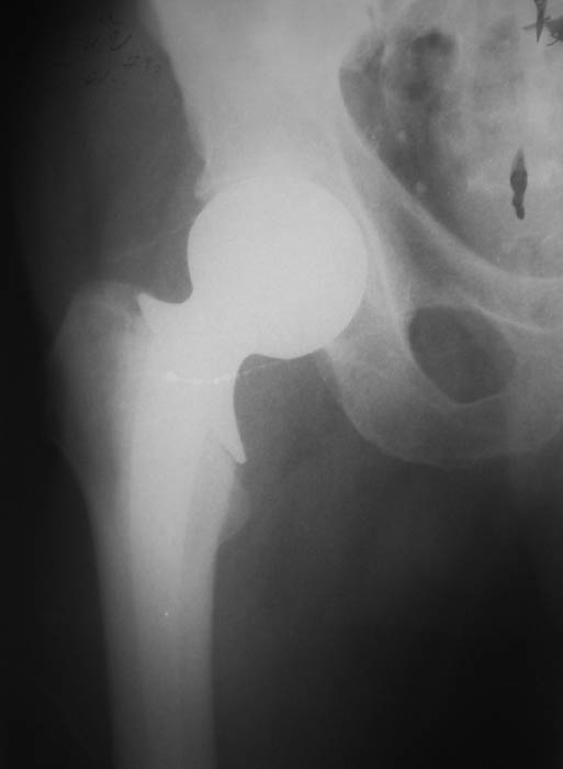 Мужчина, 77 лет. В 2000 г. по поводу субкапитального перелома шейки бедренной кости произведена операция эндопротезирования головки. На последних рентгенограммах обнаружена протрузия головки эндопротеза.