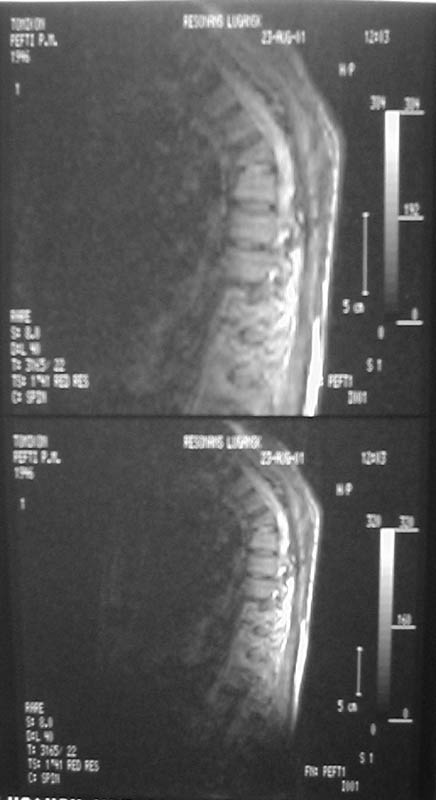 Мужчина, 48 лет. 8.04. 2000 г. - сочетанная травма: компрессионные переломы тел Th4- Тh6 и L1 позвонков с синдромом полного нарушения проводимости спинного мозга -
