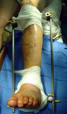 Техника сегодня более щадящая, временные несложные аппараты наружной фиксации: Spanning 2 pin ExFix, Traveling traction для лигаментотаксиса, иначе сокращенные мягкие ткани невозможно восстановить позже.