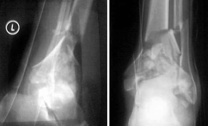 This is a pilon fracture. I suggest fixation of the fibula with a one-third tubular plate and a joint spanning external fixator on the medial side as initial treatment. If the tibial articular surface cannot be reconstituted, the patient will require an arthrodesis.