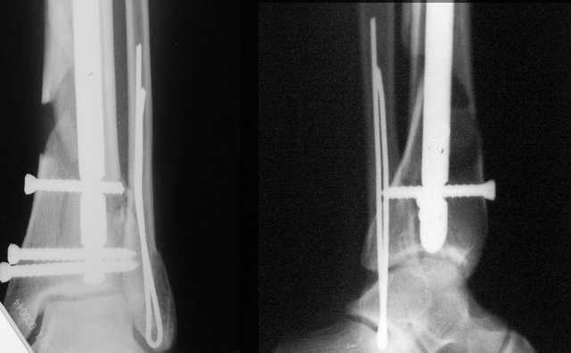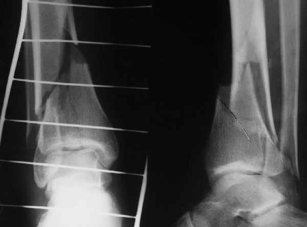Восстановливая длину и ротацию малоберцовой кости, затем относительно легче произвести реставрацию остальных элементов перелома дистального эпиметафиза болшеберцовой кости.