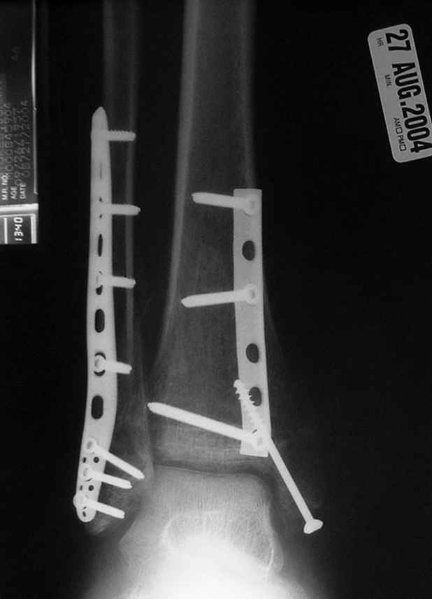 На прямой проекции послеоперационного Рг макроскопически все выглядит очень анатомично, при микроскопическом ( :-)) ) рассмотрении можно все-таки заметить вальгизацию тарана, суставная щель в латеральном отделе сустава несколько уже , чем в медиальном при отсутствии латерального смещения тарана. У меня был аналогичный случай (без LISS , без мини доступа) с вальгусным наклоном тарана при восстановленном ankle mortise при последовательном наблюдении с интервалами в 6-8 недель в послеоперационном периоде отмечалось прогрессирующее сужение суставной щели в латеральном отделе сустава, закончившееся посттравматическим ОА, к счастью боли умеренные, купируемые аналгетиками или своими эндорфинами:-))(активная пациентка, у которой нет времени на болезни....) Какова жизненная ситуация в приведенном вами случае? И последнее, что я хотел бы прояснить для себя - фиксация внутренней лодыжки: я обычно комбинирую фиксацию компрессирующим винтом со спицей - по идее ротационная стабильность должна быть лучше, чем один винт, каковы ваши наблюдения в этом плане?