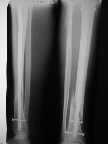 Пример, приведённый Вами в нашей дискуссии по времени нагрузки после остеосинтеза не совсем удачный... Ваш больной имеет счастье, что первым согнулся проксимальный замыкающий винт, а не дистальный и гвоздь не пенетрировал голеностопный сустав.