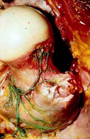 Это доказательство того, что при осторожнем (хирургическом) вывихе головки, питающий сосуд еще не повреждается и можно работать в суставе изнутри без боязни АВН головки.