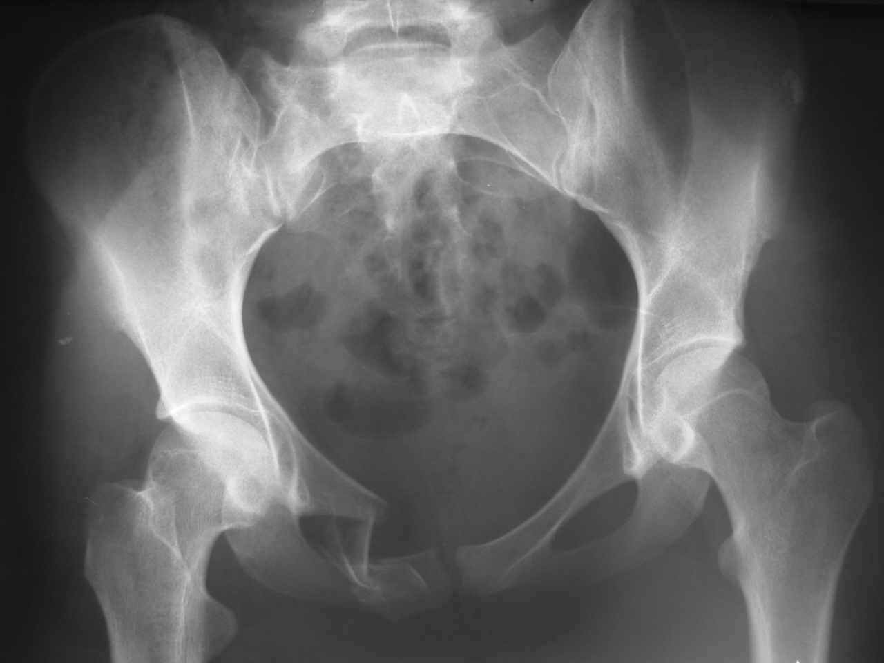 В принцине анатомия - функционально обоснованное пространственное расположение образований, составляющих тазовое кольцо. Если внимательно присмотреться даже к этому снимку - можно выявить грубую деформацию, сравнимую со смещением по длине, ширине и под углом диафиза длинной трубчатой кости. Кроме того имеет место импрессионный перелом боковых масс крестца, ротационное смещение правой половины таза, грубое нарушение непрерывности костного остова по лобковой дуге с линейным и ротационным