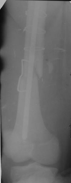 Просьба простить за длительное молчание, не было фотоаппарата, чтобы перенести рентгенограммы. Больного прооперировали в прошлый четверг, как и предполагали, голень проблем не доставила(настолько, что даже не ввели дистальные винты по ряду причин: срок после травмы, целая малоберцовая, последующая длительная ходьба без нагрузки, да и гвоздь сел плотно). Изначально планировали после удаления фиксатора антеградно завести стержень и утопить конец, но вопрос был исчерпан, когда выяснилось, что все имеющиеся стержни слишком длинные, пришлось ретроградно забить большеберцовый гвоздь, после рассверливания; серьезные проблемы возникли с устранением ротации. В вертельной области сломали стержень-джойстик(привет установщику эндопротеза), дальнейшие манипуляции проводили пучком спиц и стержнем с кондуктором. Закончили все аппаратом таз-бедро. Решили что возможные огрехи с ротацией устраним после открытого вправления. Снимки прилагаю. Спасибо за участие в обсуждении. Обязуюсь информировать о дальнейших этапах лечения.