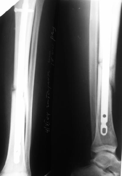 Назначил больному день операции, но он растворился где-то во вселенной вместе со снимками, поэтому показать не могу. Это был случай оскольчатого естественно нестабильного перелома : сразу после стабилизации боли постепенно ушли и несмотря на рекомендации не нступать на ногу до 8 недель, больной начал и продолжал ходить, нагружая ногу, пока винт не сломался.