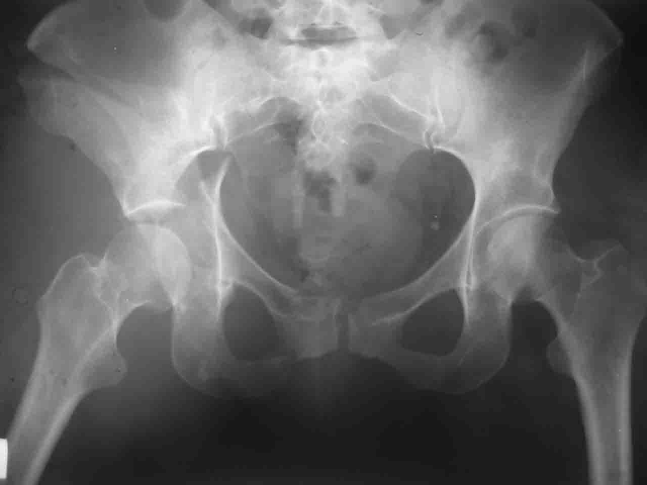 На рентгенограммах - высокий двухколонный перелом вертлужной впадины с нарушением конгруэнтности, имеется обратная клиновидность суставной щели.