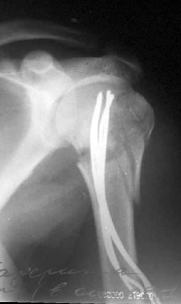Обычно перкутанной фиксацией спицами я пользовался у детей и подростков при проксимальных эпифезеолизах, концы загибал и погружал подкожно. Но несмотря на *простительные* процессы сращения у детей с удивительной перестройкой костной мозоли, детишки не очень охотно мобилизовали плечевой сустав, в основном активные движения появлялись только после удаления спиц через 3-4 недели. Очевидно, это связано с миофасциодезом дельтовидной мышцы. В обсуждаемой технике миофасциодеза не возникает так как выступающая спицевая петля находится под мышцей, периоссально, обеспечивая свободное скольжение мышечных волокон, а следовательно и свободу движений.