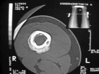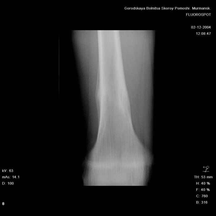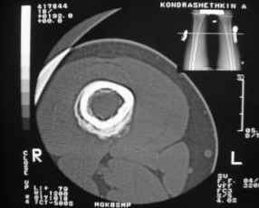 Анамнез практически никакой: в следствие травмы (растяжение связок коленного сустава) от 07.11.2004 выполнены Rg-граммы в травмпункте и обнаружено опухолевидное образование. Первичные Rg-граммы я не публикую, так как они заметно худшего качества, да и динамики за прошедшие три недели не отражают. Болевой синдром купирован в течение трёх дней. В настоящий момент мальчика ничего не беспокоит. Ходьба не нарушена, опухоль пальпируется с трудом по задней поверхности в н\3 правого бедра, пальпация безболезненна, объем движений в суставах правой нижней конечности полный и симметричный. Кожа над опухолью не изменена. В нашей клинике проведено дополнительное обследование: общие анализы крови и мочи, биохимия крови без особенностей. Выполнены Rg-граммы на цифровом Siemens обычные и продольные томограммы срезами 3-5 мм, а также компьютерная томография поперечными срезами по 5 мм. Прошу обратить внимание, что на приведённых томограммах видны две полости 10х15 мм и 15х60 мм. Также имеются два опухолевидных образований наслаивающихся друг на друга: уплощённое и вытянутое 10х100 мм и элипсовидной формы 15х30 мм. Это хорошо заметно на фото a_1.jpg c_1.jpg и d_1.jpg. Плотность внутри полостей 125% от плотности костномозгового канала, плотность наружного опухолевидного образования 55% от плотности кортикального слоя. Также отмечается линия перелома по центру наружного опухолевидного образования. Исходя из полученных данных мнения в плане диагноза несколько разделились от 1)сочетания кортикальной фиброзной дисплазии и латентно протекавшего маршевого перелома н\3 правого бедра до 2)остеосаркомы. В отношении первого варианта не сходится отсутствие клиники при переломе такой крупной кости как бедро, второй вариант вообще оставлю без комментария, ибо некомпетентен. Хотелось бы услышать мнения коллег, с удовольствием ознакомлюсь с любыми предположениями и замечаниями. С уважением, Александр Е. Клоков Отделение детской ортопедии и травматологии БСМП г. Мурманска.