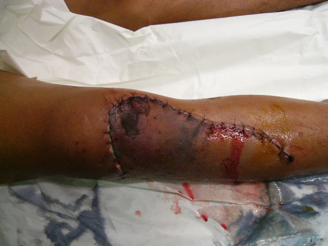 Беда в том, что иссекая нежизнеспособные ткани происходит обнажение кости (рефиксироанная бугристость) м медиального края надколенника. Образовался обширный дефект наружной группы мышц. Литров 10 стерильного физ раствора извел на промывание раны. Заказал снимки, завтра поглядим.