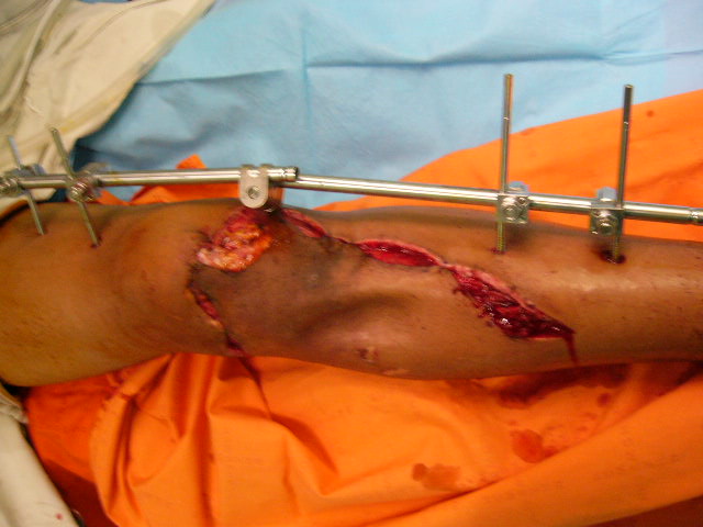 Спасибо за рекомендации. Сегодня взял больного на очередную хирургическую обработку и внешнюю фиксацию, картинки в приложении. При обработке опять иссекал ушибленные неркотизированные мышцы, частично кожный лоскут (явные признаки демаркации). связка надколенника разволокнена и выглядит едва ли жизнеспособной, пришлось частично убрать *лохмотья*.
