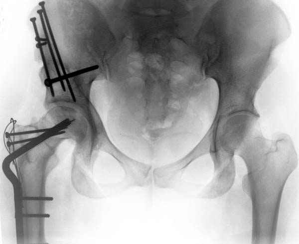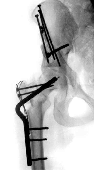 6 Клинковая пластина не совсем может симпатично, то, что пластина реконструктивная с выгибом в области большого вертела. Мне думается, этот выступ должен ощущаться неполными пациентами особенно в положении на боку. Опять таки для улучшения качества жизни после операции, может использовать обычную клинковую пластину с соответствующим углом, без означенного изгиба? Проволоку фиксирующую вертел вы ведь вводили в отверстие в кортикале бедра?, может ее лучше было бы фиксировать к пластине, например к шурупу, будет более надежно, кость ведь зачастую прорезается. Тем более, что тракция отводящих мышц за вертел достаточно велика:
