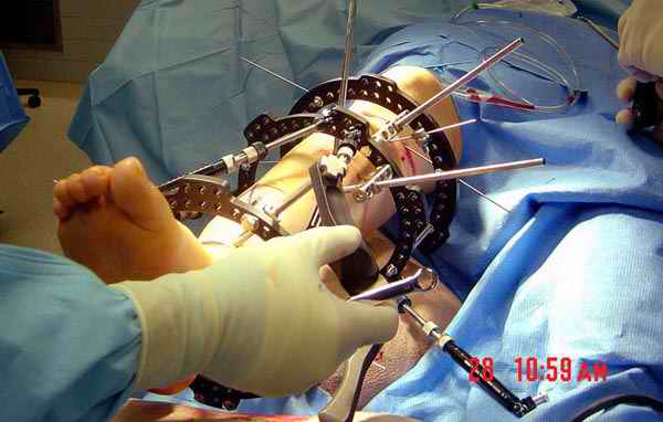 На слайдах (не четко обозначены бедро и голень): на бедре по наружно-передней поверхности, между вастус латералис и прямой головками, а на голени по передне-медиальной поверхности, желателен подбор длины резьбовой части стержня по ширине поперечника кости. На снимке: дистальное кольцо, метод проведения стержня через канюлю-проводник.