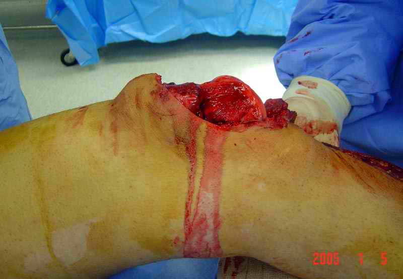 автодорожка по типу приведенной Вами и падение с высоты. В одном случае после ПХО и репозиции наложили скелетное вытяжение чтобы получить время на осмысление. Рана была очень сильно загрязнена землей и травой (это при падении с высоты). При ПХО шили связку надколенника, сам он был целым. Сустав дренировали с подшиванием синовиальной капсулы к коже. Мягкие ткани зажили очень быстро. Пациентка продолжала пьянствовать. Выписали в гипсовом туторе. Через два месяца сняли, больше в сустав не залезали. Осталась контрактура - разгибание - 170, сгибание - 100.