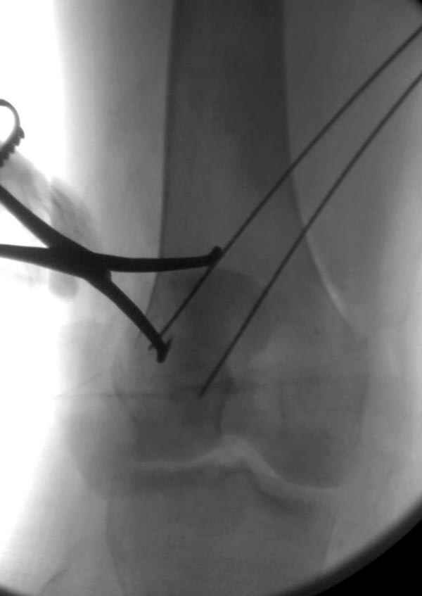 Внешний фиксатор держим около 6 недель, поэтому был выбран метод фиксации шурупами и еще линия перелома была диагональной, не было нужды в tension band technique, cannulated screws удобнее, провел спицы и по ним шурупы.