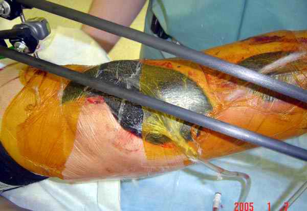 Сегодня досылаю остальные снимки, которые не прошли вчера. Как вчера писал, после фиксации перелома надколенника с дефектом кости и собственной связки, наложили ваккуум и наружный фиксатор. (снимки 4-9)