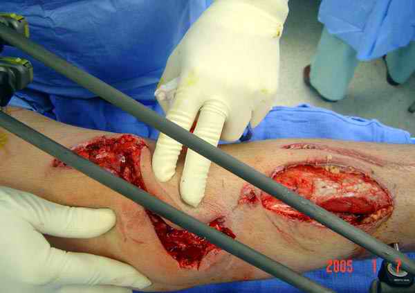 При открытых переломах Type1-2, придерживаемся следующей тактики: дебрайдмент, фиксация перелома и рана прикрывается мокрой повязкой или ваккуум, т.е. не закрываем рану первично!, через два или три дня, в зависимости от состояния раны пройзводим закрытие. При некрозе кожи продолжается иссечение с повторными дебрайдмент.