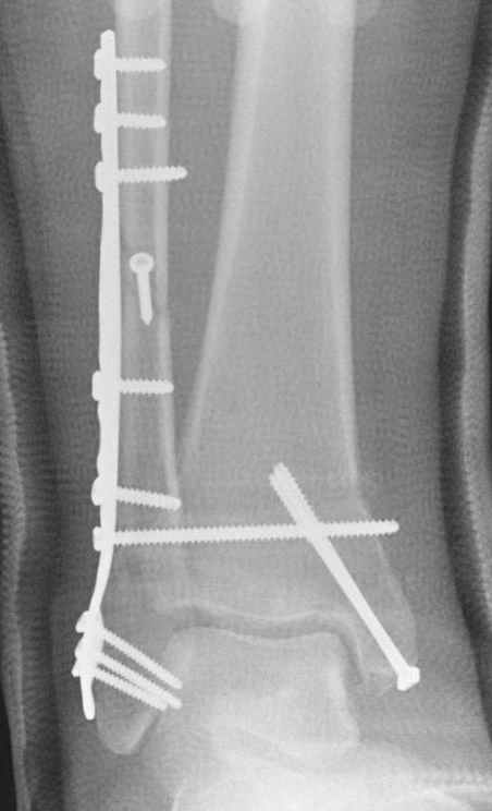 Ну а уж если выбран остеосинтез - нначать надо было с репозиции малоберцовой кости с точным восстановлением длины, с фиксацией треть-трубчатой пластиной по задней поверхности. Позиционный винт