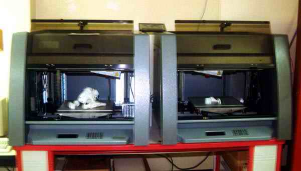 Мы пользуемся менее быстрым, недорогим принтером, принцип работы нашего принтера - термопластический материал под действием тепла, в виде струи толщиной 0.2 мм очерчивая создает модель, КТ данные обрабатывается предварительно программой Mimic и Materialize, но для каждого сканнера должен быть специальный код для читки.