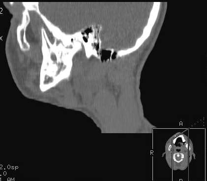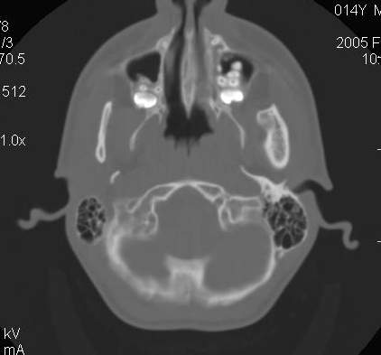 Пациент В., 13 лет. Диагноз: Костный анкилоз левого височно-нижнечелюстного сустава (ВНЧС), левосторонняя микрогения. Болеет с 2-х летнего возраста. Возможная причина развития анкилоза – воспалительный процесс (в первые 1,5 года жизни часто болел простудными заболеваниями, травму родители отрицают). В 3 и 5 лет проводилась редрессация – безуспешно.