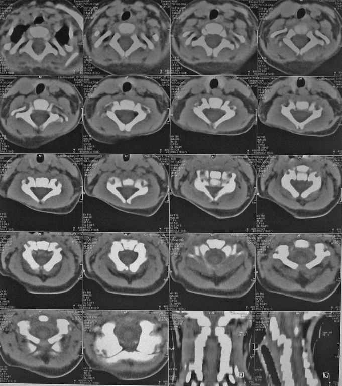 Девочка 5 месяцев, дочь коллеги, врача-анестезиолога, тетрапарез, в ногах спастический в руках - вялый, усугубившийся после "мануальной терапии". Данные рентгена,КТ и МРТ прилагаются. Кроме того, имеется двухсторонний врожденный вывих бедра.По совокупности данных - болезнь Ларсена.В шейном отделе - дисплазия и гипоплазия суставных отростков С3-С5 с передним подвывихом и антелистезом, патологическим кифозом и стенозом позвоночного канала до 55% от исходного (5 мм при исходном 9 мм). Spina bifida occulta в 5 сегментах, в том числе расщепление задней дуги атланта, агенезия его передней дуги. Признаки спинальной компрессии и диффузной миелопатии на уровне стеноза.Вопрос - возможно ли в таком нежном возрасте оперативное лечение и вообще, какая должна быть тактика ?
