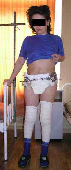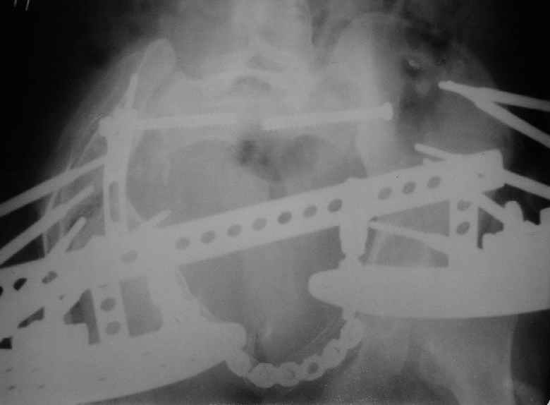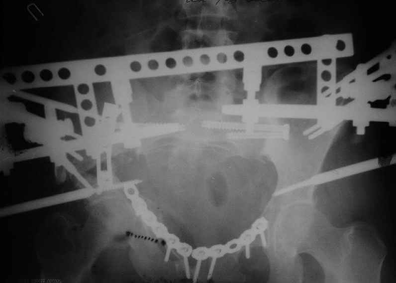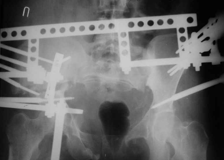 Уважаемые коллеги, вашему вниманию предлагается продолжеие истории лечения больной с двусторонней деформацией таза . Итак, 26.01.05 была выполнена остеотомия правой подвздошной кости, низведение правой вертлужной области, остеосинтез правой подвздошной кости пластиной, чрескостный остеосинтез аппаратом таз-бедро.  Снимок после первого этапа | После заживления раны и стабилизации общего состояния 22.02.05 была выполнена реконструкция переднего отдела таза, синтез лонных костей пластиной, опора с бедра демонтирована, выполнено введение илиосакральных винтов с обеих сторон. В настоящее время рана зажила первичным натяжением, больная ходит с двумя костылями без опоры на правую нижнюю конечность. С интересом ждем ваши комментарии.