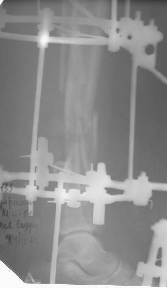 2. Провести остеотомию сегментарную м/берцовой кости напротив дефекта и медленно этот сегмент подвести с помощью спиц в место дефекта. Можно не дожидаться полного заживления ран.