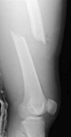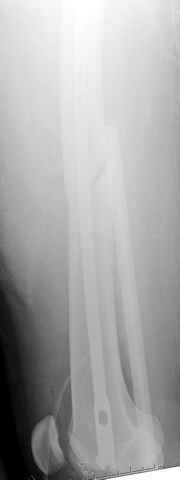 По поводу открытого перелома больной ургентно взят на ретроградное интрамедулярное штифтование, после рутинного дебрайдмента и фасциотомии на бедре и на голени.