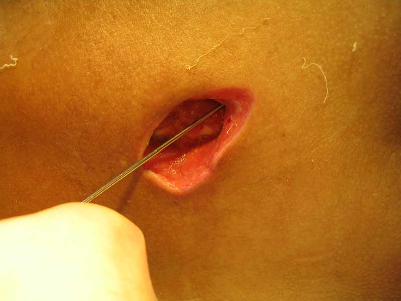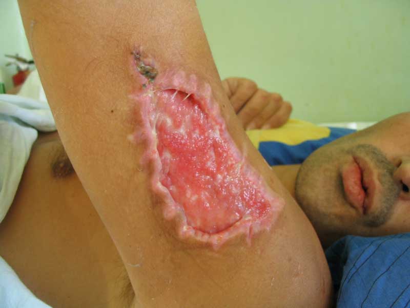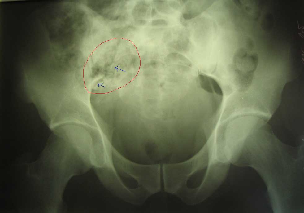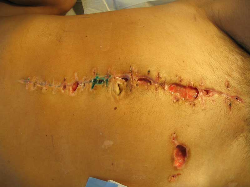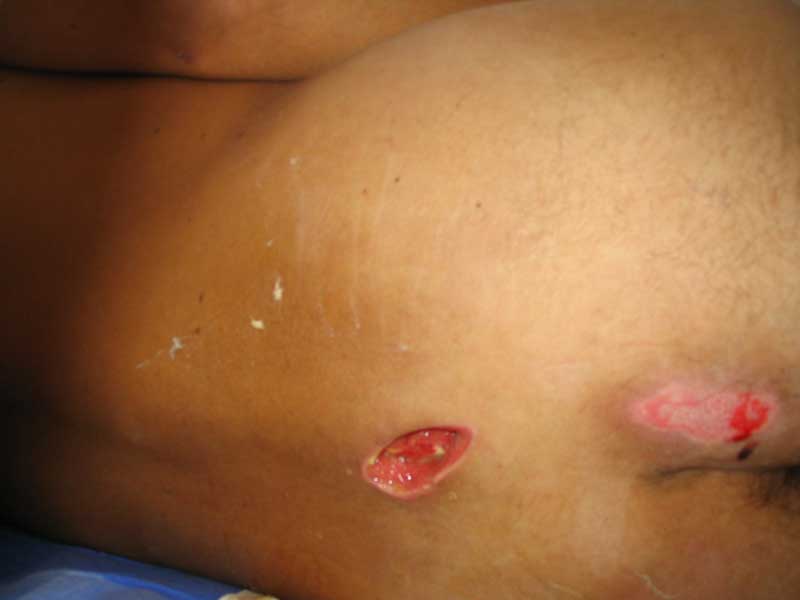 живот |  крестец |  плечо |  спина |  снимок |  снимок-схема | Поработал, блин... Шмальнули в него из"калаша" почти в упор: сквозное ранение живота с повреждением подвздошной кишки (вход -правая подвздошная область, выход на крестце), касательное левого плеча (пуля прошла подкожей) и практически царапина на правом плече.Ранение - 6.03, в этот же день прооперирован - ушивание ран подвздошной кишки и т.н."обработка" раны левого плеча (зачем-то удалили отслоенный мостик кожи... :-/ ). Черездень - релапаротомия, резекция участка подвздошной кишки. До России он добрался только25.03 (КАК он добрался - отдельная история...), с хорошо гноящимися и разошедшимися ранамина передней брюшной стенке, крестце и левом плече (см. фото в аттаче). В принципе с ранамивсе понятно, санация-заживление-пластика... И это не самое страшное... Сегодня выполнена рентгенография - оскольчатый перелом крестцово-подвздошного сочленениясправа. Плюс к этому - выраженный парез правой н/конечности с выпадением чувствительностии парестезиями (хотя частично чувствительность сохранена, и какое-то подобие произвольныхдвижений тоже есть). Поэтому хотелось бы спросить - какова должна быть тактика в отношенииперелома (режим, лекарства и т.п.) и в отношении неврологии? Также интересуют возможныеисходы... Приветствуются все мысли, замечания и предложения... -- С уважением, Андрей Башлачев mailto:bashlachev@yandex.ru Ивановская государственная медицинская академия, кафедра хир. болезней пед. ф-та