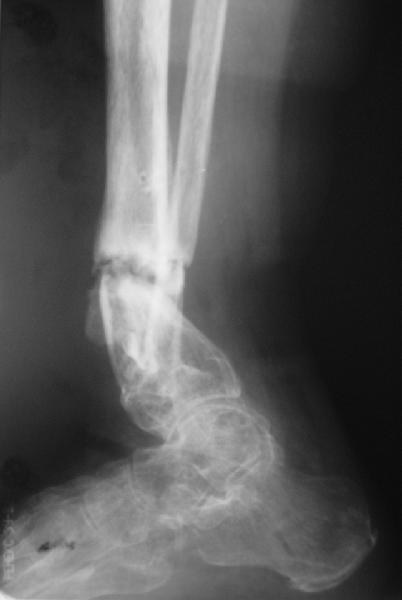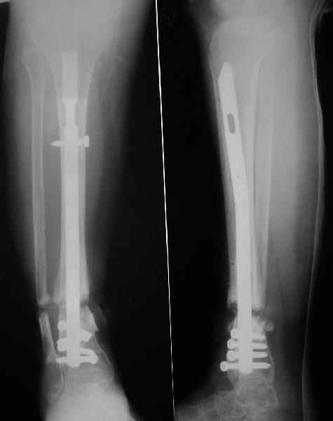 Какова подвижность в голеностопе? Если движений в суставе практически нет (о чем можно предположить по Ргграмме) и инфекция исключена, я бы подумал о ретроградном штифтовании через таран.